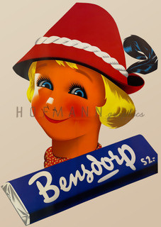 Ein Klassiker der Werbegeschichte: Dieses charmante Plakat des Atelier Hofmann aus den 1950er-Jahren wirbt für die bekannte Schokoladenmarke Bensdorp. Mit einem fröhlichen Mädchen im roten Hut, leuchtenden Farben und klarer Formensprache verkörpert das Motiv die optimistische Nachkriegszeit und den typischen Stil der Mid-Century-Werbung.