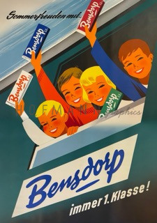Kinder winken aus dem Zugfenster und zeigen Riegel Bensdorp – Reiselust und Feriengefühl im typischen 50er‑Look.