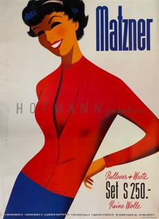 Elegante Damenfigur in rotem Strick – feine Airbrush‑Optik, schlanke Mid‑Century‑Silhouette. Textdetails: »Set S 250.– Reine Wolle « Matzner.